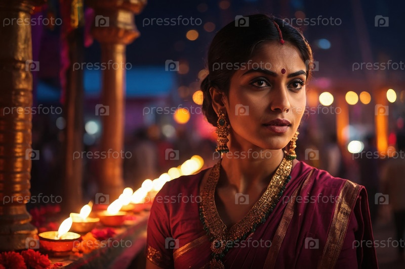 Молодая индийская женщина с портретом в традиционной одежде на фоне фестиваля Дивали