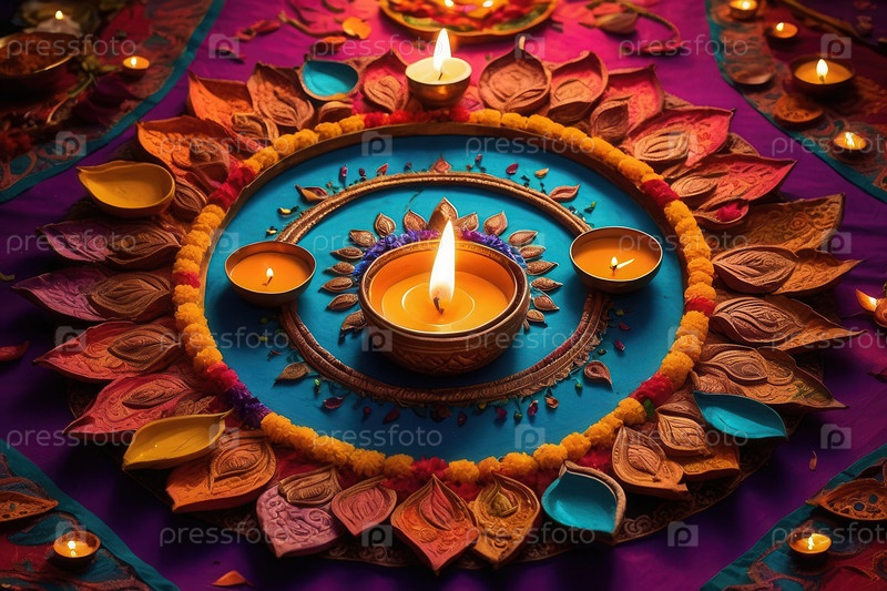 Дивали красочные украшения традиционные свечи, масляная лампа, цветы и миски копировать ИИ генеративное пространство