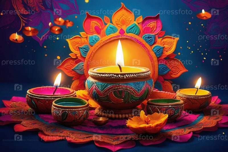 Дивали красочные украшения традиционные свечи, масляная лампа, цветы и миски копировать ИИ генеративное пространство