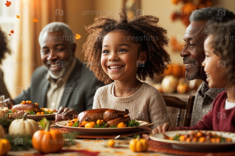 Большая семья мужчин и женщин, сидящих за праздничным украшенным столом на День благодарения