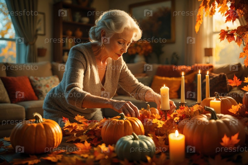 Старушка украшает обеденный стол желтыми листьями и апельсиновыми тыквами на День благодарения