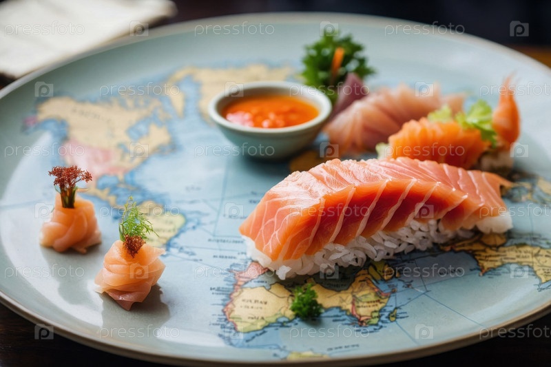 Японское блюдо сашими суши рыба на карте, открытка Всемирный день продовольствия AI Generative