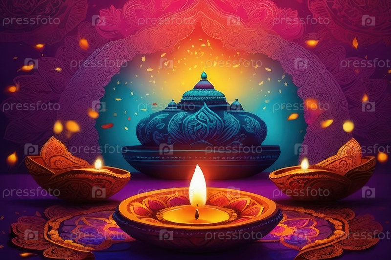 Дивали красочные украшения традиционные свечи, масляная лампа, цветы и миски копировать ИИ генеративное пространство