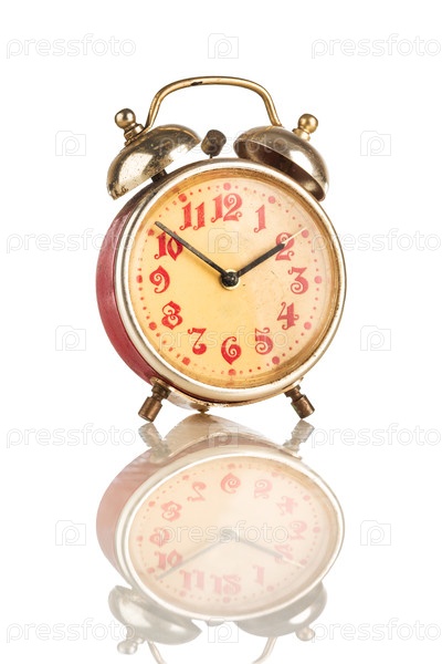 Старый аналоговый будильник на белом фоне