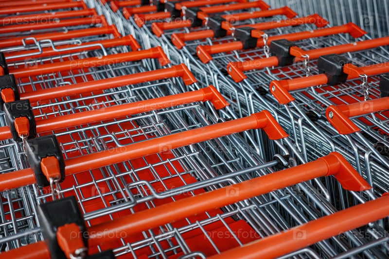 Ряд тележек с красными ручками.Торги выстроены в ряд и все одного цвета