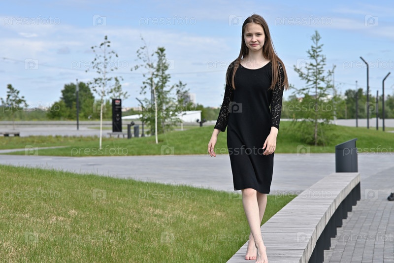 Женщина в черном платье ходит босиком по тротуару парка в солнечный день