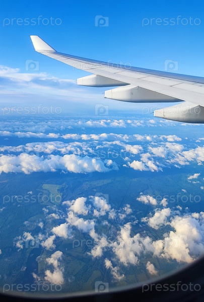 Вид на крыло самолета над облаками в ясный солнечный день с голубым небом