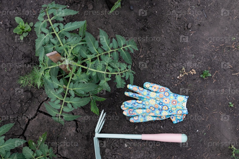 Садовник стремится к молодому растению томата в богатой темной почве. Ранние перчатки лежат рядом с небольшим садовым инструментом. Сцена запечатлела радость приземления в домашнем саду