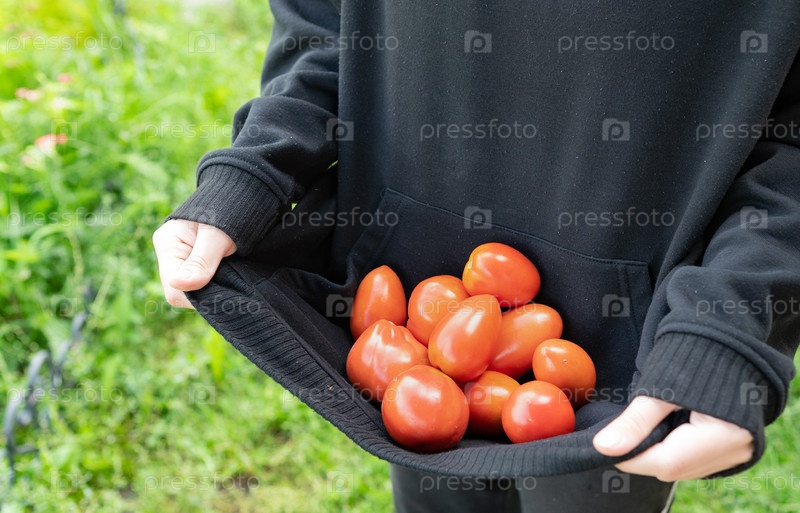 Руки держат карман черной толстовки с капюшоном, наполненный ярко-красными помидорами, отражающими день обильного урожая в пышно-зеленом саду под ясным небом