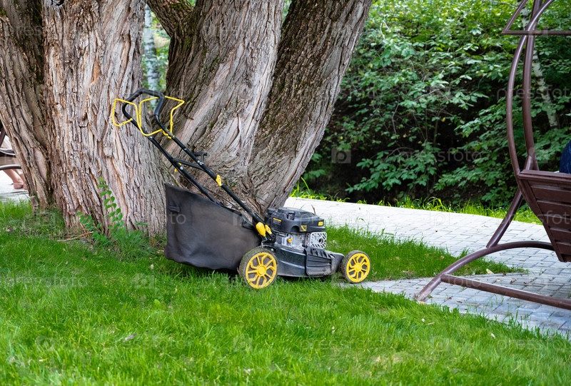 Растительная машина припаркована рядом с большим деревом в саду с пышной зеленой травой и асфальтированным тротуаром