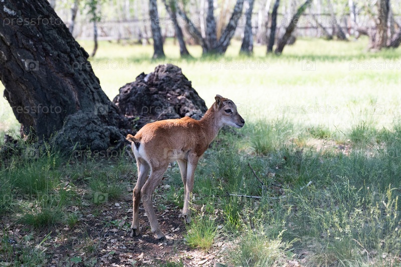 Молодая горная коза грациозно перемещается по травянистой местности, исследуя свое окружение, в то время как солнечные лучи фильтруют деревья в спокойной среде