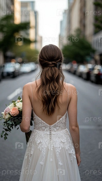 Невеста стоит на пустынной дороге с букетом в руках