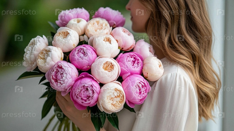 Девушка с букетом пиоников в руках