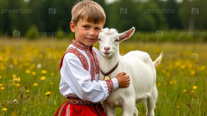 Мальчик в народных костюмах и белой рубашке рядом с белым козлом на цветочном лугу