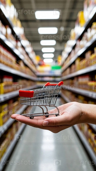 Небольшая металлическая тележка из супермаркета на ладони женщины на фоне полок в магазине