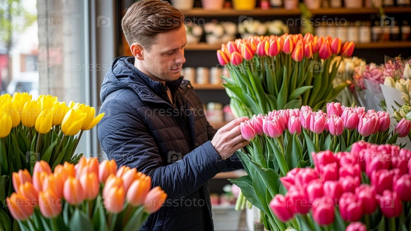 Мужчина покупает цветы тюльпанов в подарок