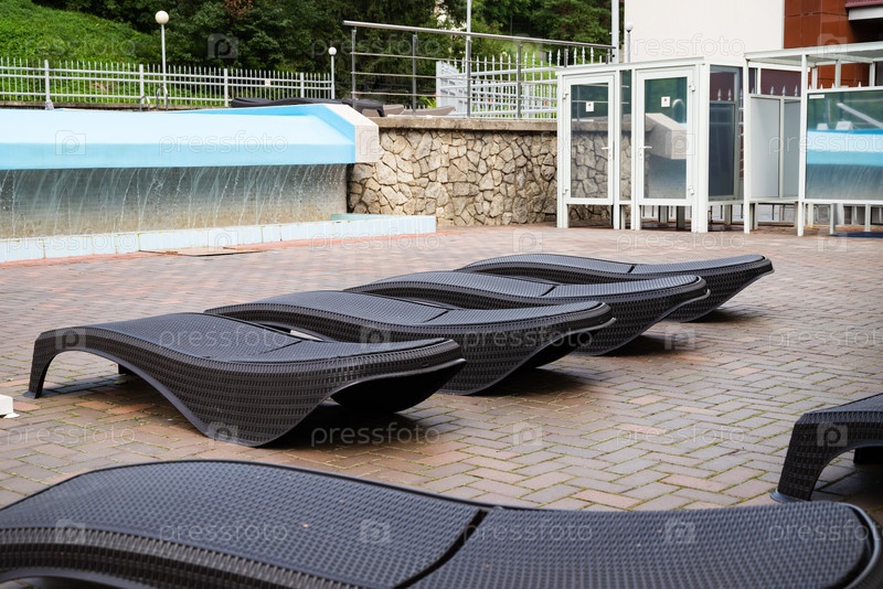 Ряд черных шезлонгов рядом с пустым бассейном на кирпичном дворе. Наружная среда на фоне каменной стены. Концепция отдыха и релаксации