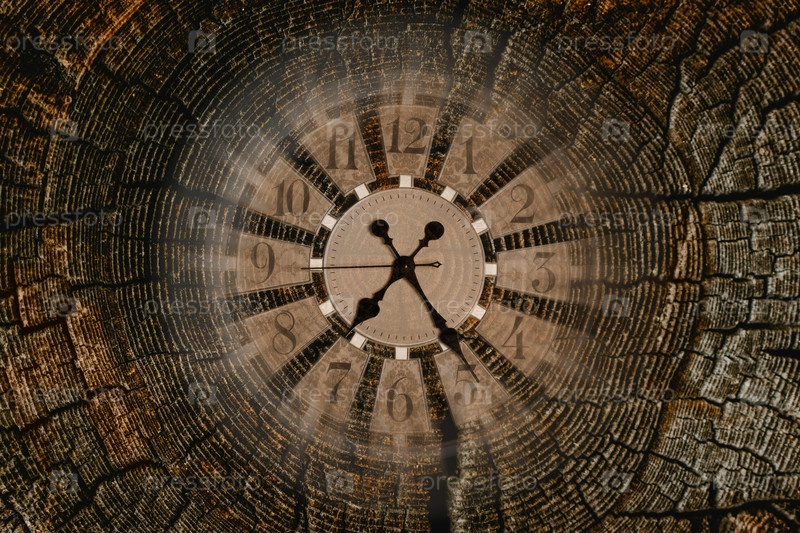 Часы, показывающие вечернее время на фоне ежегодных колец старого ствола дерева.Концепция зрелости, старения и течения времени