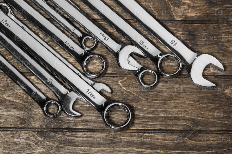Набор открытых и кольцевых ключей различных размеров из нержавеющей стали, заложенных по диагонали на деревянном фоне