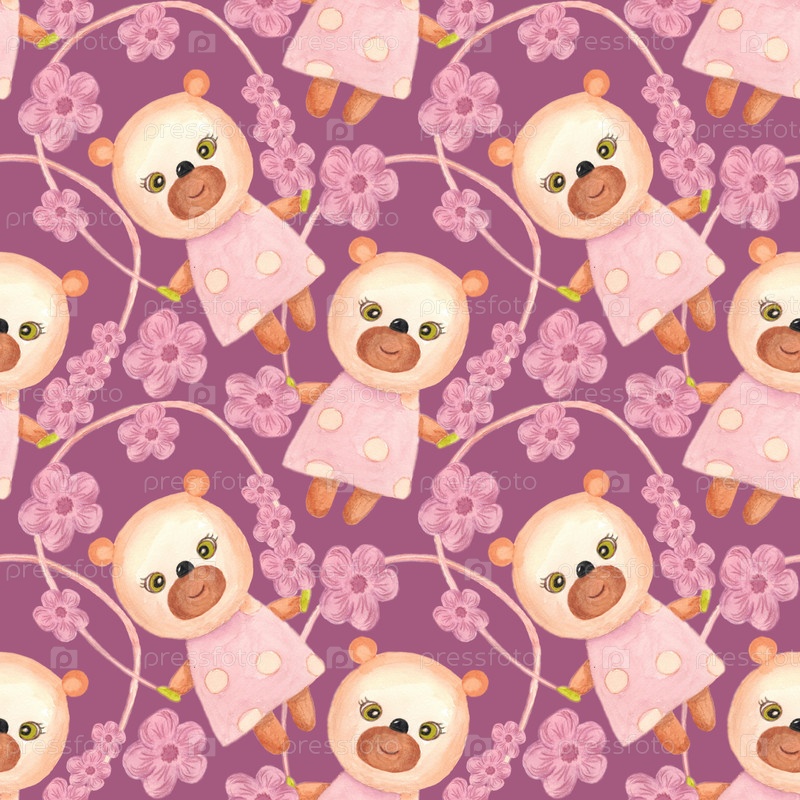 Медведь и розовые цветы. Бесшовный рисунок с фиолетовым фоном. Медведь прыгает на веревке. Иллюстрация написана вручную акварелью. Она может использоваться для детских тканей, упаковочной бумаги,