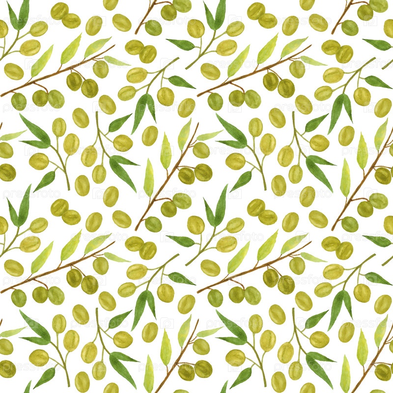 Бесшовный рисунок, оливки на белом фоне. Иллюстрация выполняется акварелью вручную. Его можно использовать для ткани, упаковочной бумаги, обложек, меню, открыток, обоев