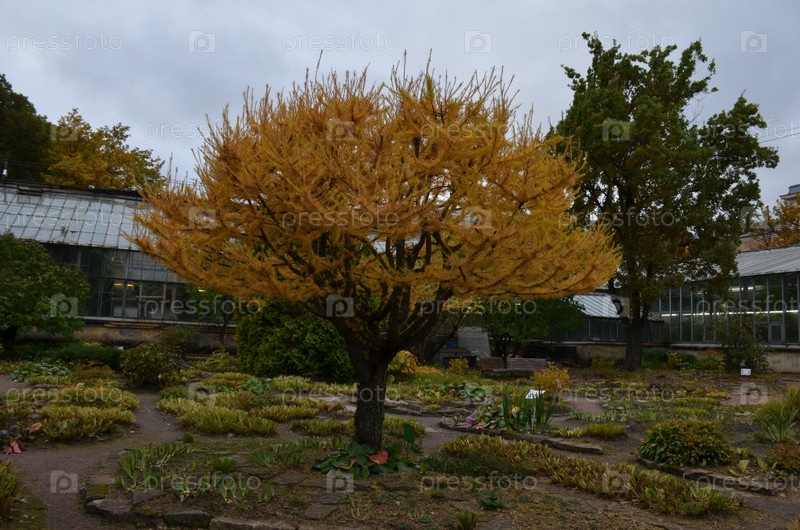 Двор (сад непрерывного цветения) Ботанического сада Петра Великого в Санкт-Петербурге осенью, в центре - личинка с ярко-желтой короной