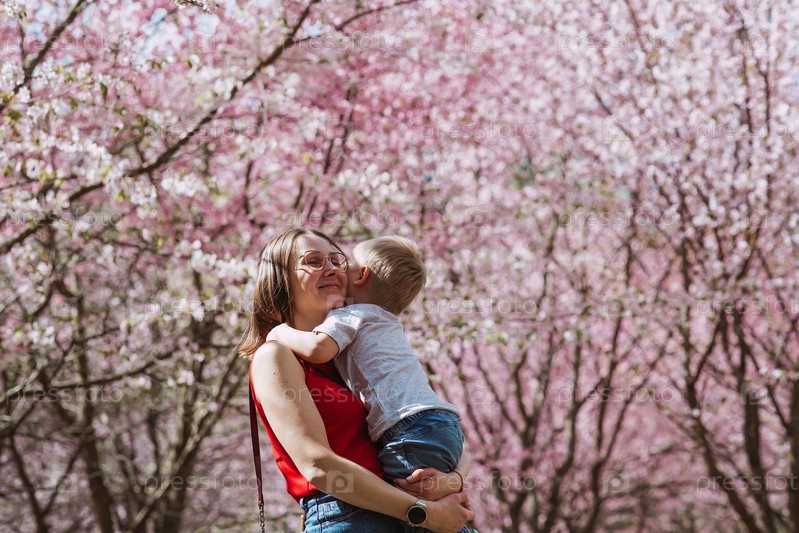 Очаровательный мальчик и мать на природе весной среди вишневых деревьев. 2-летний веселится и улыбается в его объятиях. Семья и любовь