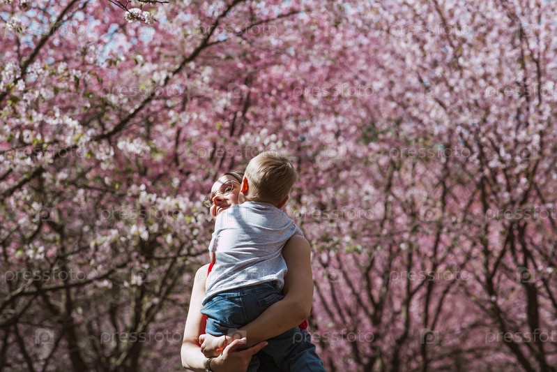 Очаровательный мальчик и мать на природе весной среди вишневых деревьев. 2-летний веселится и улыбается в его объятиях. Семья и любовь