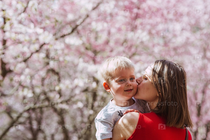 Очаровательный мальчик и мать на природе весной среди вишневых деревьев. 2-летний веселится и улыбается в его объятиях. Семья и любовь