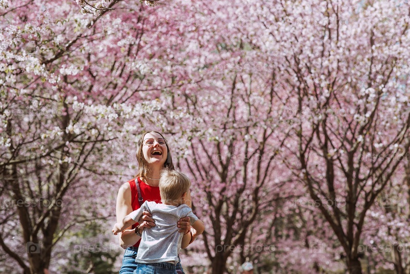 Очаровательный мальчик и мать на природе весной среди вишневых деревьев. 2-летний веселится и улыбается в его объятиях. Семья и любовь