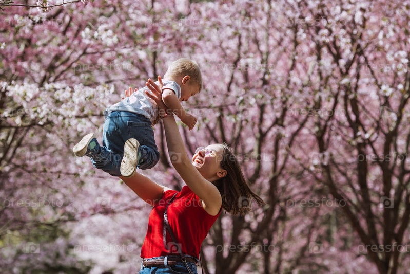 Очаровательный мальчик и мать на природе весной среди вишневых деревьев. 2-летний веселится и улыбается в его объятиях. Семья и любовь