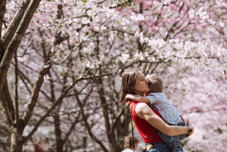 Очаровательный мальчик и мать на природе весной среди вишневых деревьев. 2-летний веселится и улыбается в его объятиях. Семья и любовь