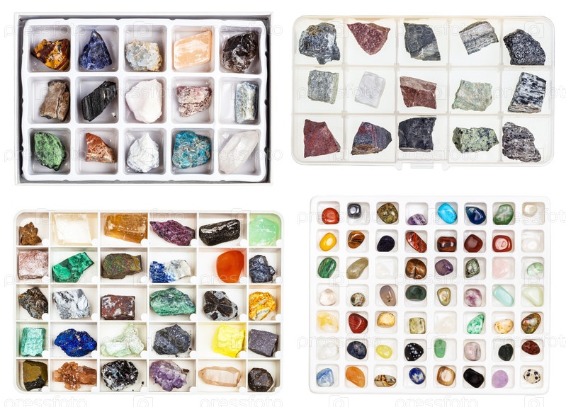 Набор различных ящиков изолированных природных минералов