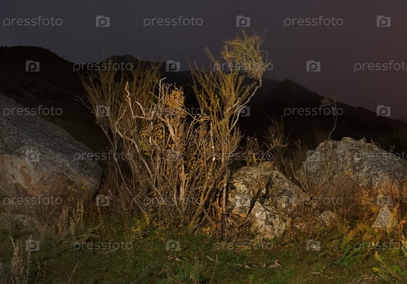 Юг Западной Сибири, Алтайские горы.Осенняя лунная ночь в каменной долине горной реки Катун недалеко от деревни Иния