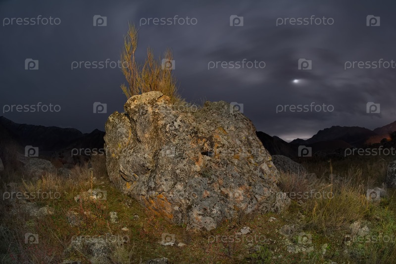 Юг Западной Сибири, Алтайские горы.Осенняя лунная ночь в каменной долине горной реки Катун недалеко от деревни Иния