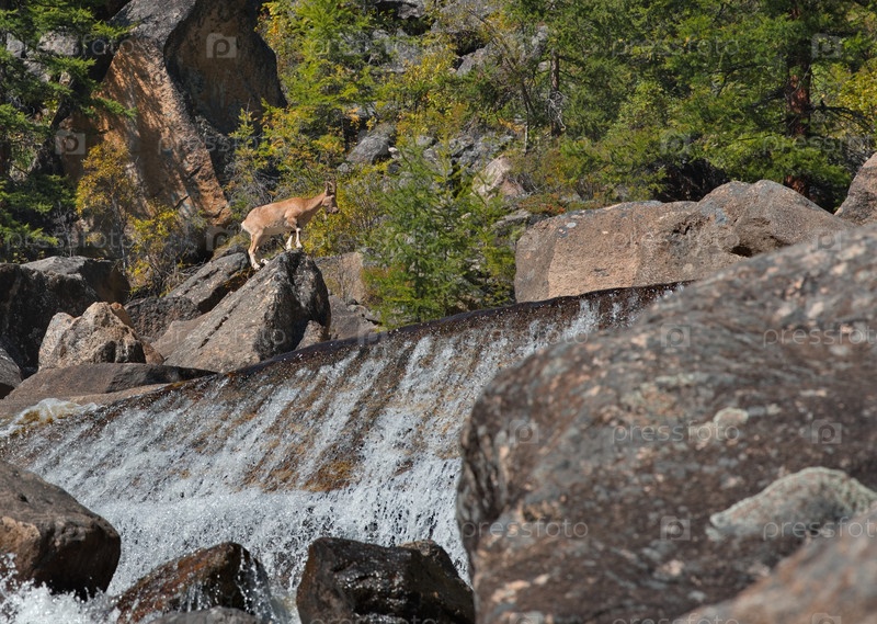Небольшое стадо горных коз прыгает над огромными обломками скал грандиозного водопада Дабат в долине реки Тисса