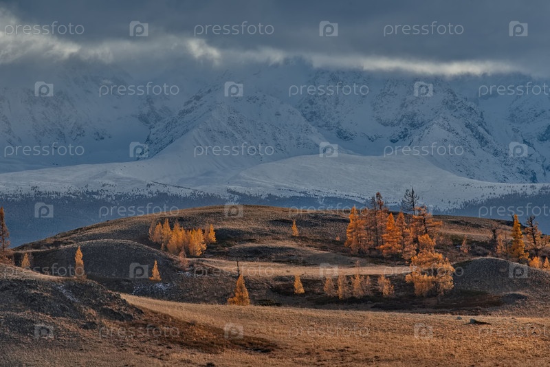 Юг Западной Сибири. Алтайские горы. Завораживающий вид на долину реки Чуя с желтыми лиственницами вдоль северного хребта Чуй в степи Курай