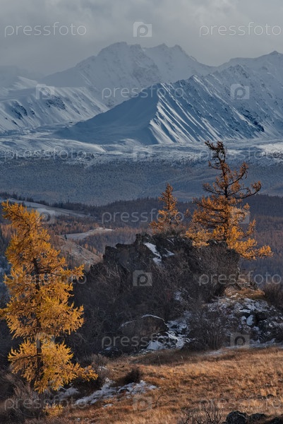 Юг Западной Сибири. Алтайские горы. Завораживающий вид на долину реки Чуя с желтыми лиственницами вдоль северного хребта Чуй в степи Курай