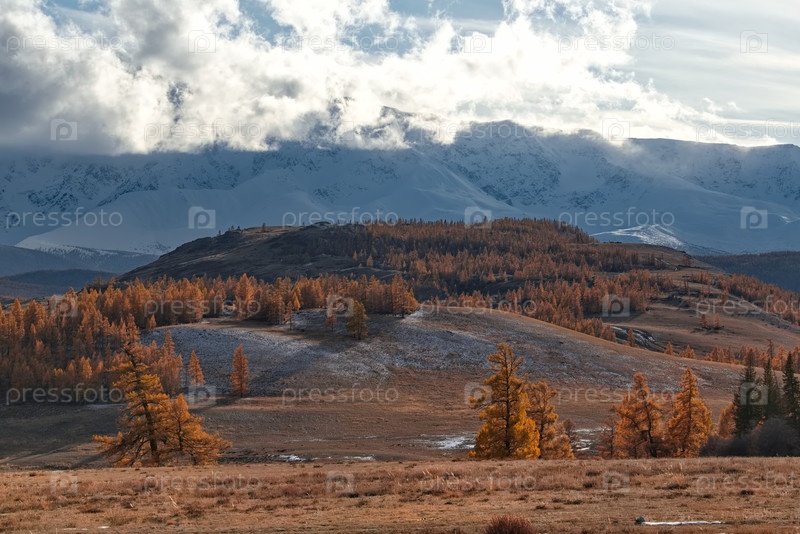 Юг Западной Сибири. Алтайские горы. Завораживающий вид на долину реки Чуя с желтыми лиственницами вдоль северного хребта Чуй в степи Курай