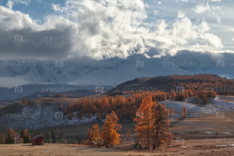 Юг Западной Сибири. Алтайские горы. Завораживающий вид на долину реки Чуя с желтыми лиственницами вдоль северного хребта Чуй в степи Курай