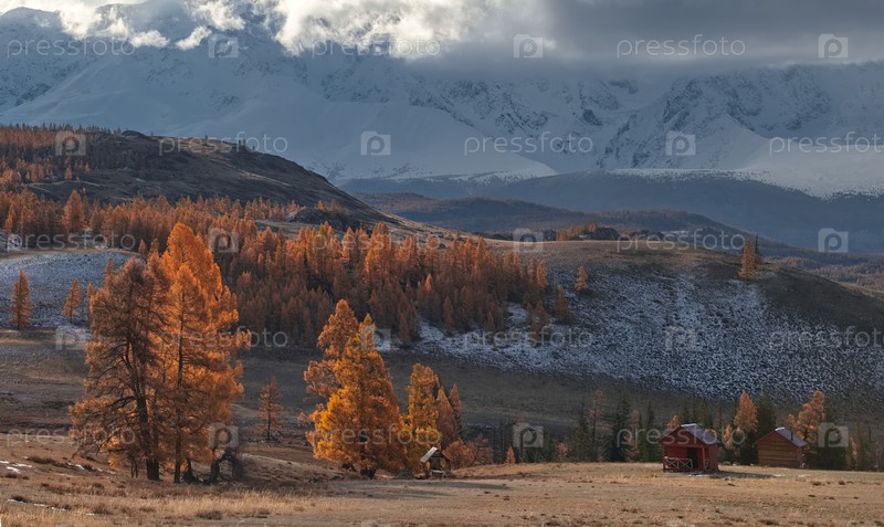 Юг Западной Сибири. Алтайские горы. Завораживающий вид на долину реки Чуя с желтыми лиственницами вдоль северного хребта Чуй в степи Курай