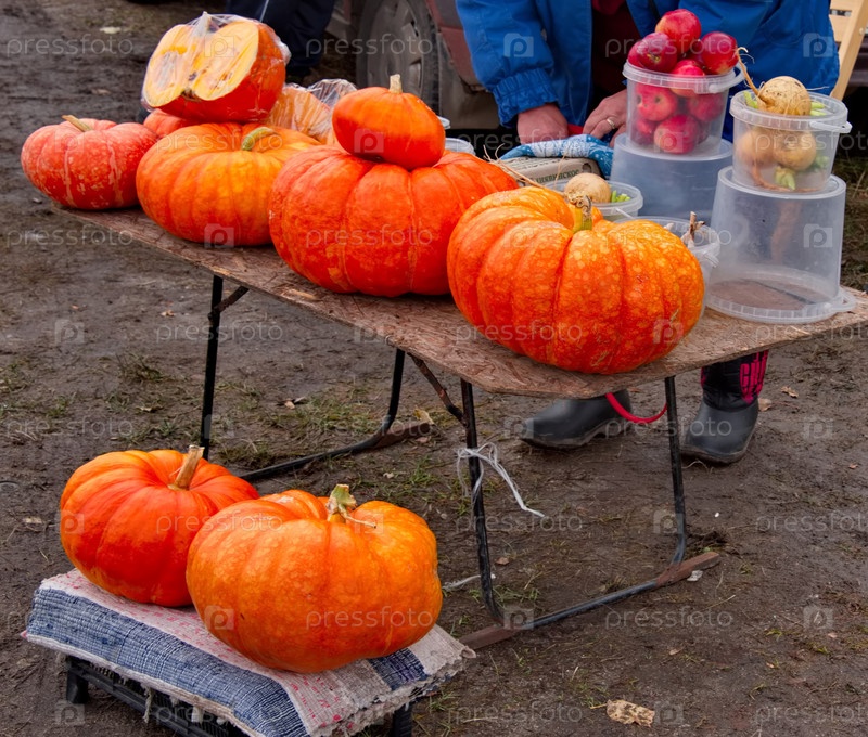 Москва, Россия 7 октября 2018 года.Пожилые жители пригородных городов столицы продают красочные огромные тыквы на обочине шоссе