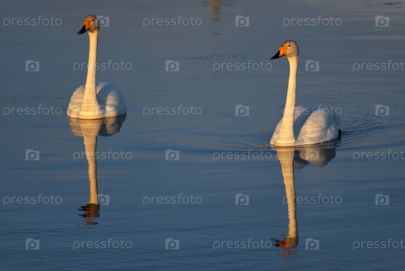 Юг Западной Сибири, горы Алтай. грациозная пара лебедей-кликунов в лучах заката солнца весеннего неба питается в деревенском озере после сложного полета