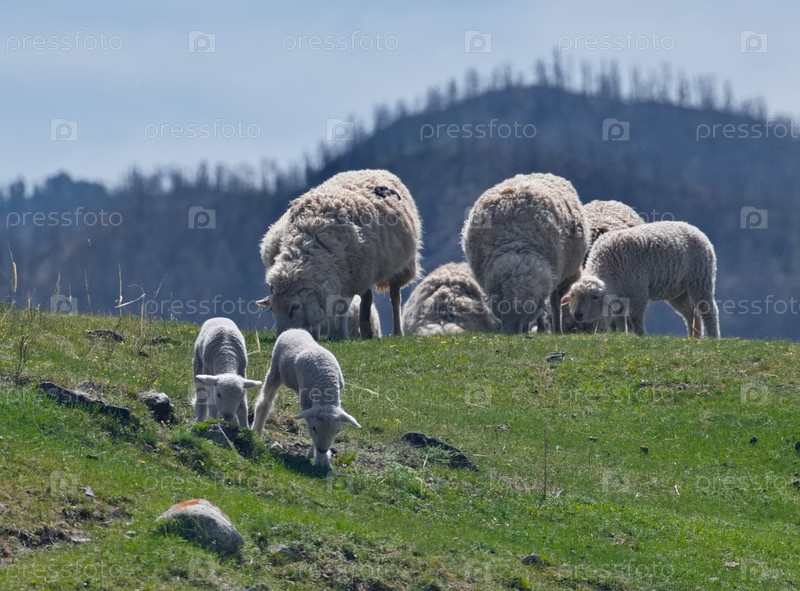 Юг Западной Сибири, Алтайские горы.Небольшое стадо домашних овец пасется на холмистых пастбищах в окружении гор вдоль Чуйского тракта