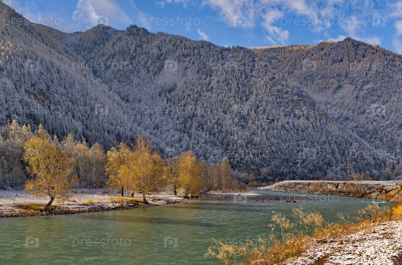 Западная Сибирь, Алтайские горы. потрясающие контрасты первых снегов на горных скалах и желтых лиственничных деревьев в долине реки Чуя вдоль Чуйского тракта