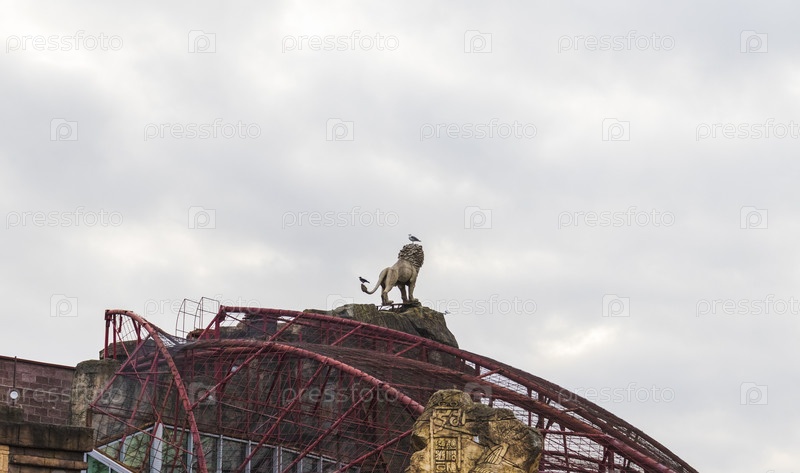 Забавный момент в зоопарке: птицы сидят на голове и хвосте скульптуры льва