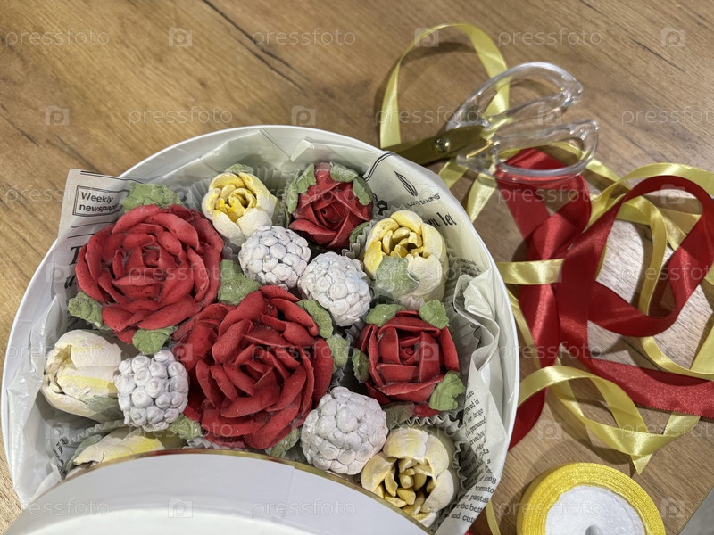 Домашнее зелье в коробке для шляп, цветы зеленых бобов, тюльпаны и розы, упаковочные ленты лежат на столе рядом друг с другом