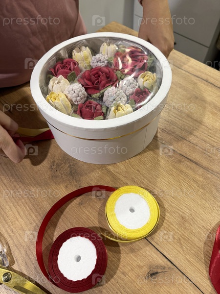 Женщина, упаковывающая самодельный зефир в коробку с шляпой с прозрачной крышкой, цветы зефира, тюльпаны и розы, пленки для упаковки поблизости