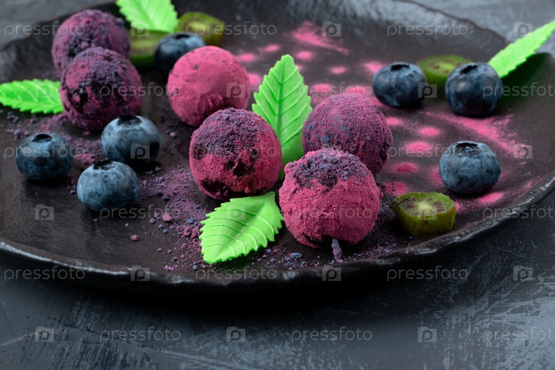 шоколадные трюфели, покрытые лиофилизованным ягодным порошком на черной тарелке. розовые и фиолетовые конфеты
