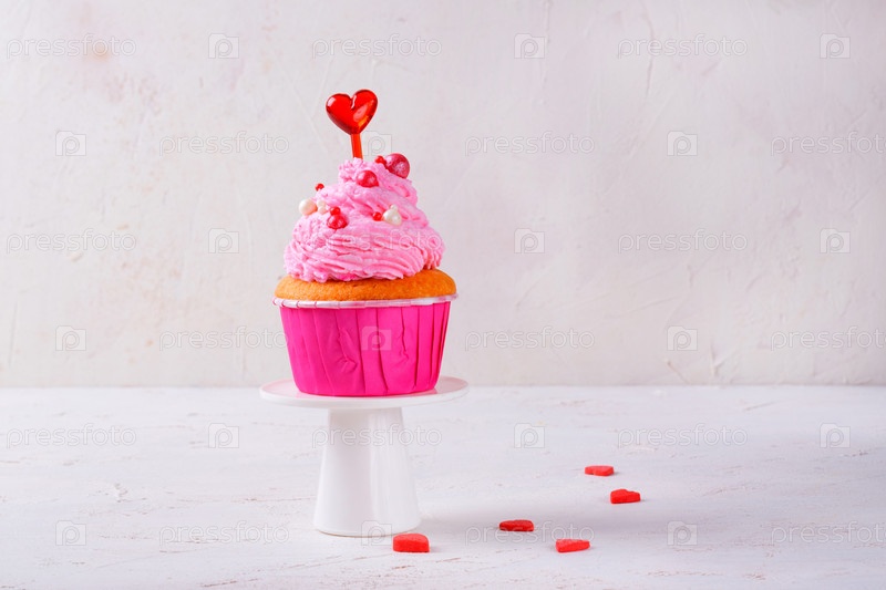 Розовая морозильная кексы, украшенные сахаром и сердечными дрожжами на тортовой стойке. десерты на День святого Валентина. копировать пространство на белом фоне